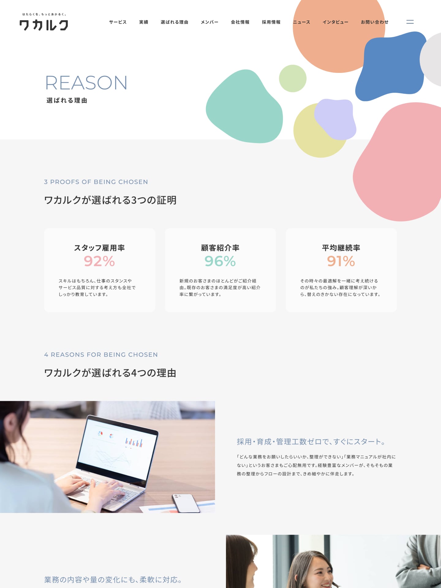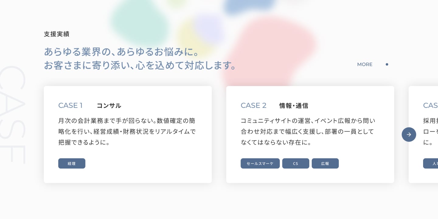 実装面では、パステルカラーややわらかな形状の印象に合わせ、ふわっとした動きのアニメーションを各所に取り入れています。視覚的な心地よさを保ちながら、サイトを訪れた人にワカルクの空気感がより伝わるよう工夫しました。