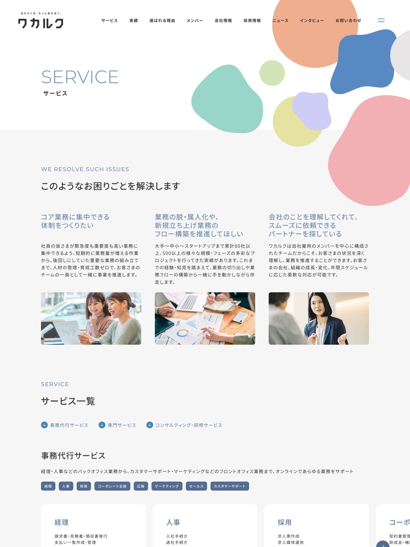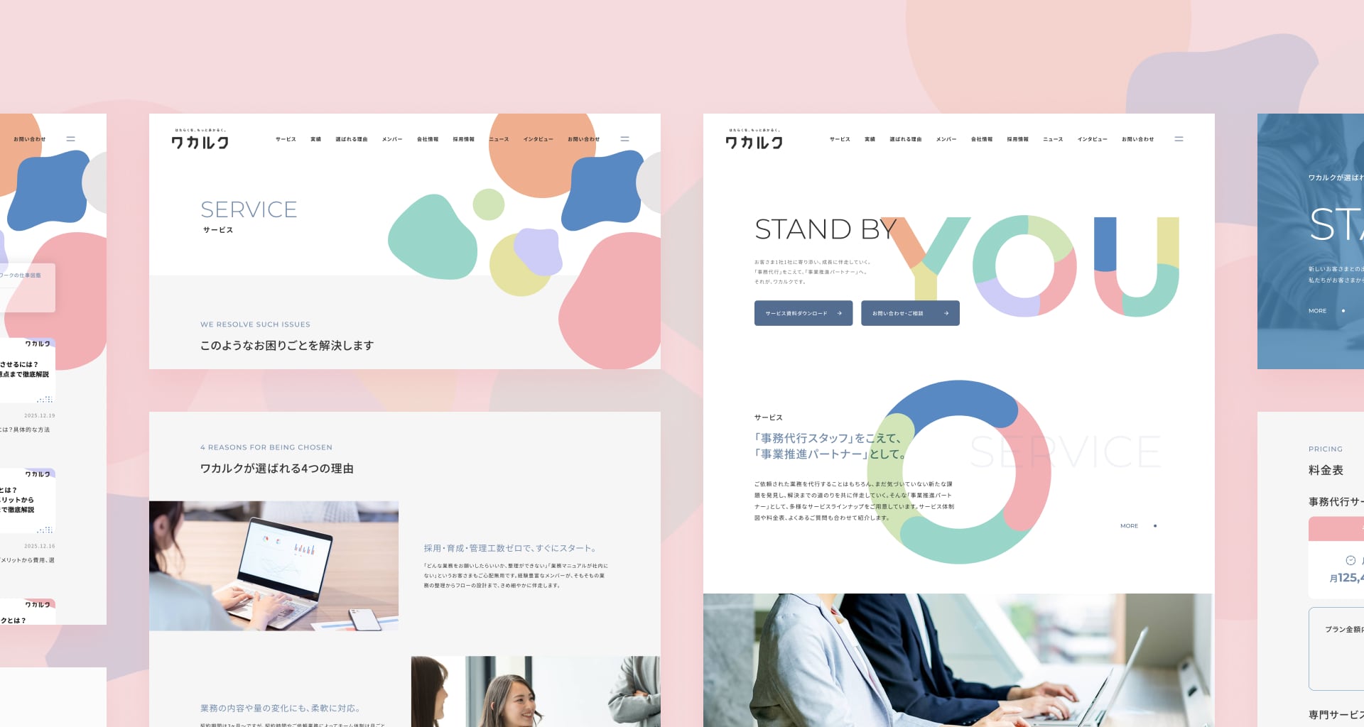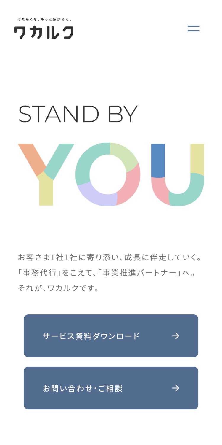 株式会社ワカルクのコーポレートサイトリニューアルに伴い、クリエイティブディレクション、アートディレクション、デザイン制作、サイト構築を行いました。2020年設立のスタートアップとして成長を続けてきた同社は、事務代行事業を軸に、働き方に関するコンサルティングや研修など、事業領域を徐々に拡大。組織規模や提供価値が変化する中で、「どんな会社で、どんなサービスを提供し、どんな人たちが働いているのか」を、より分かりやすく伝えたいという課題感が生まれていました。そこで今回は、会社の全体像や事業内容が一目で理解できることを主題に、ワカルクらしさが自然と伝わるコーポレートサイトを目指しました。